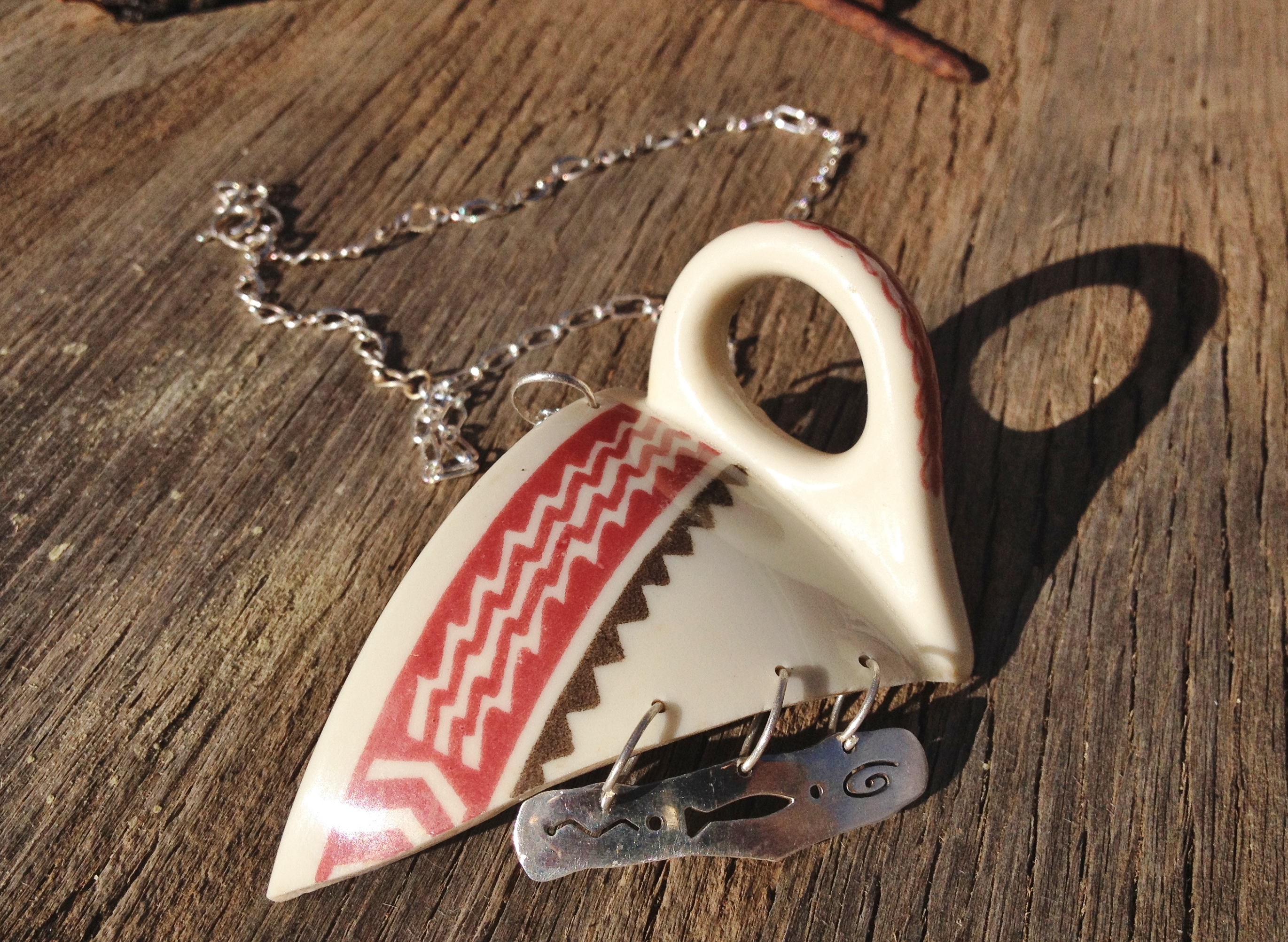 I create small wearable sculptures using these scarce, sweat-earned remnants of an amazing British-American visionary: Fred Harvey. In 1902, Mr. Harvey hired designer and architect Mary Colter to create among many other things, the Mimbreño china pattern which was used exclusively in the dining car of the Santa Fe Chief. This pattern made its debut in 1937. The train dining cars were staffed with Harvey Girls: proper young women working as waitresses on the trains and in Fred Harvey’s hotels and restaurants across the southwest. I was told that if a dish chipped or broke on the train, out the window it would go resulting in the potshards I find today.