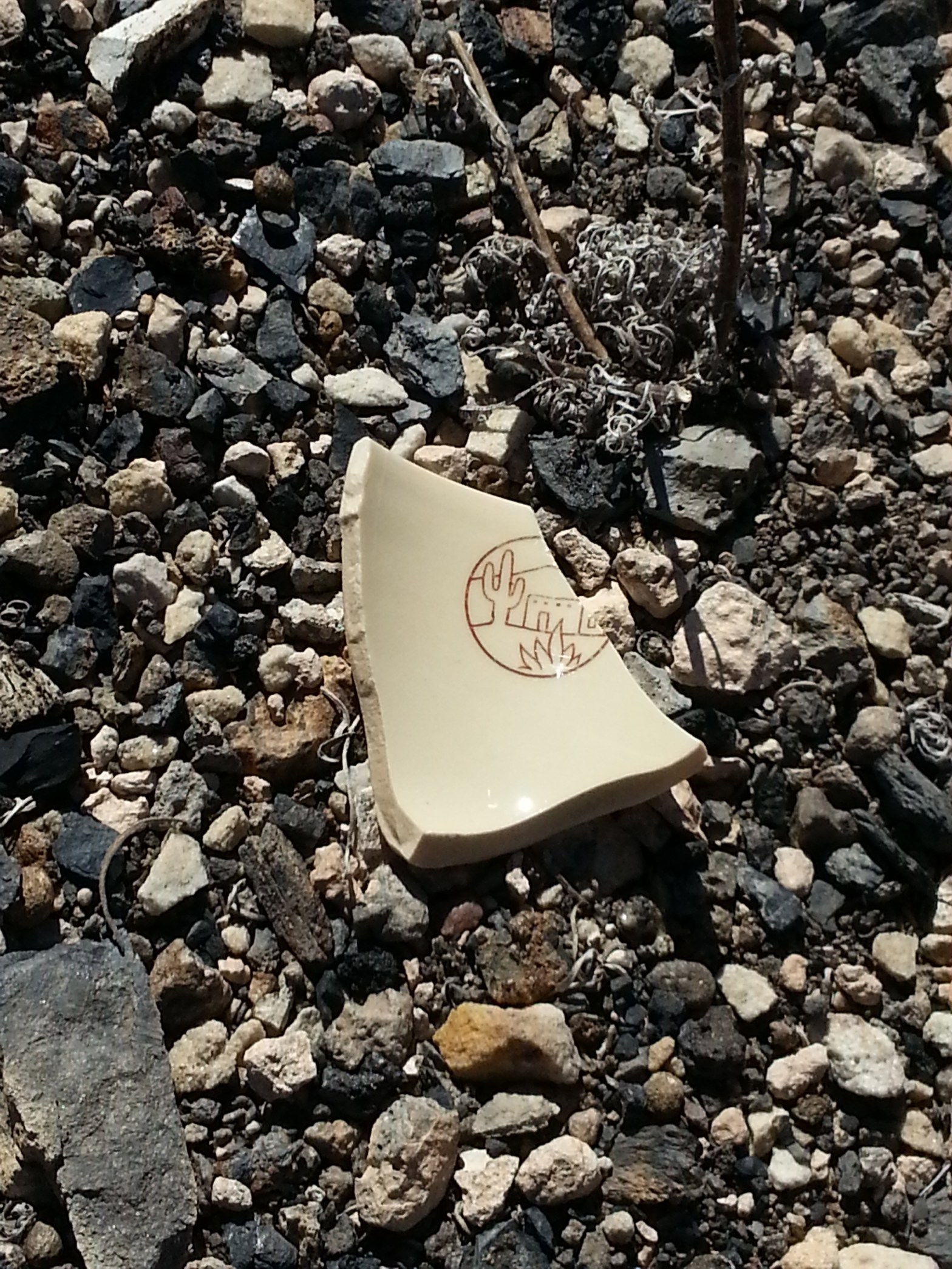 As I walk the railroad tracks searching for old bits of Fred Harvey and Santa Fe pottery, I have started documenting what these pieces look like before I transform them. Here are a few of those photos. To see my sculptures and learn more, please see the Fred Harvey Line.