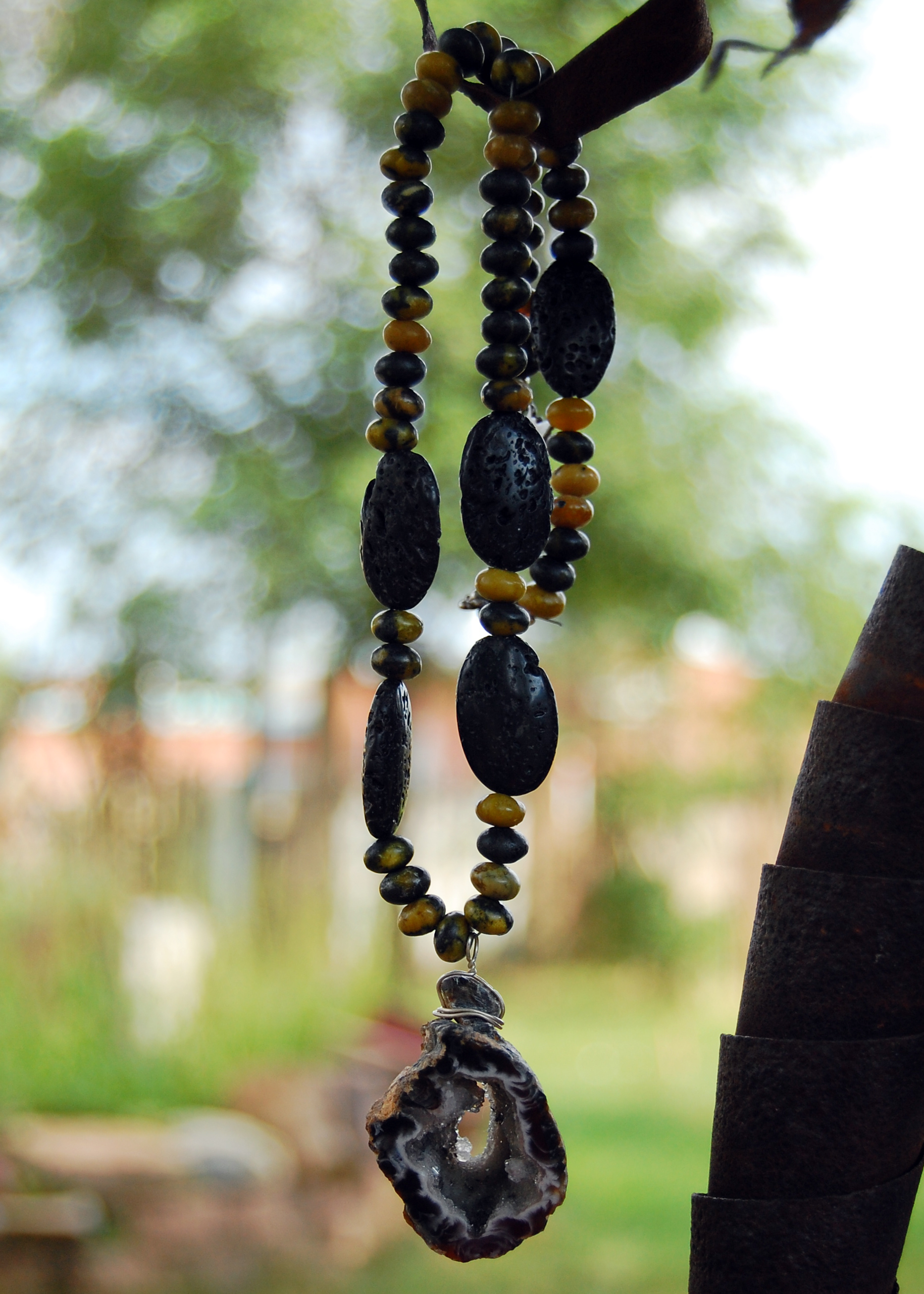 Previous Image Next Image Black Geode Necklace, geode, basalt and green mineral beads, sterling silver