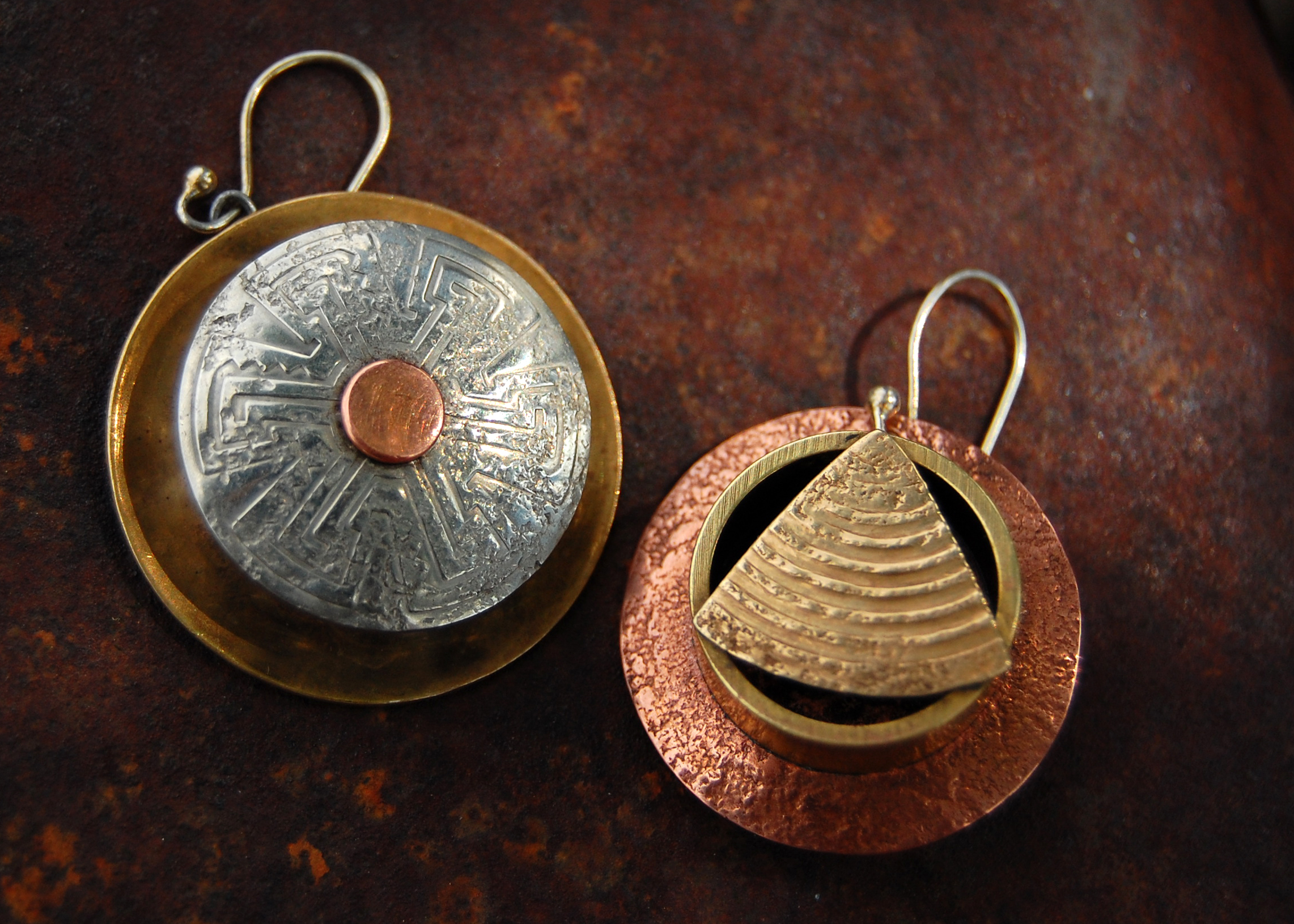 Redwood City Earrings, brass, copper, silver metal