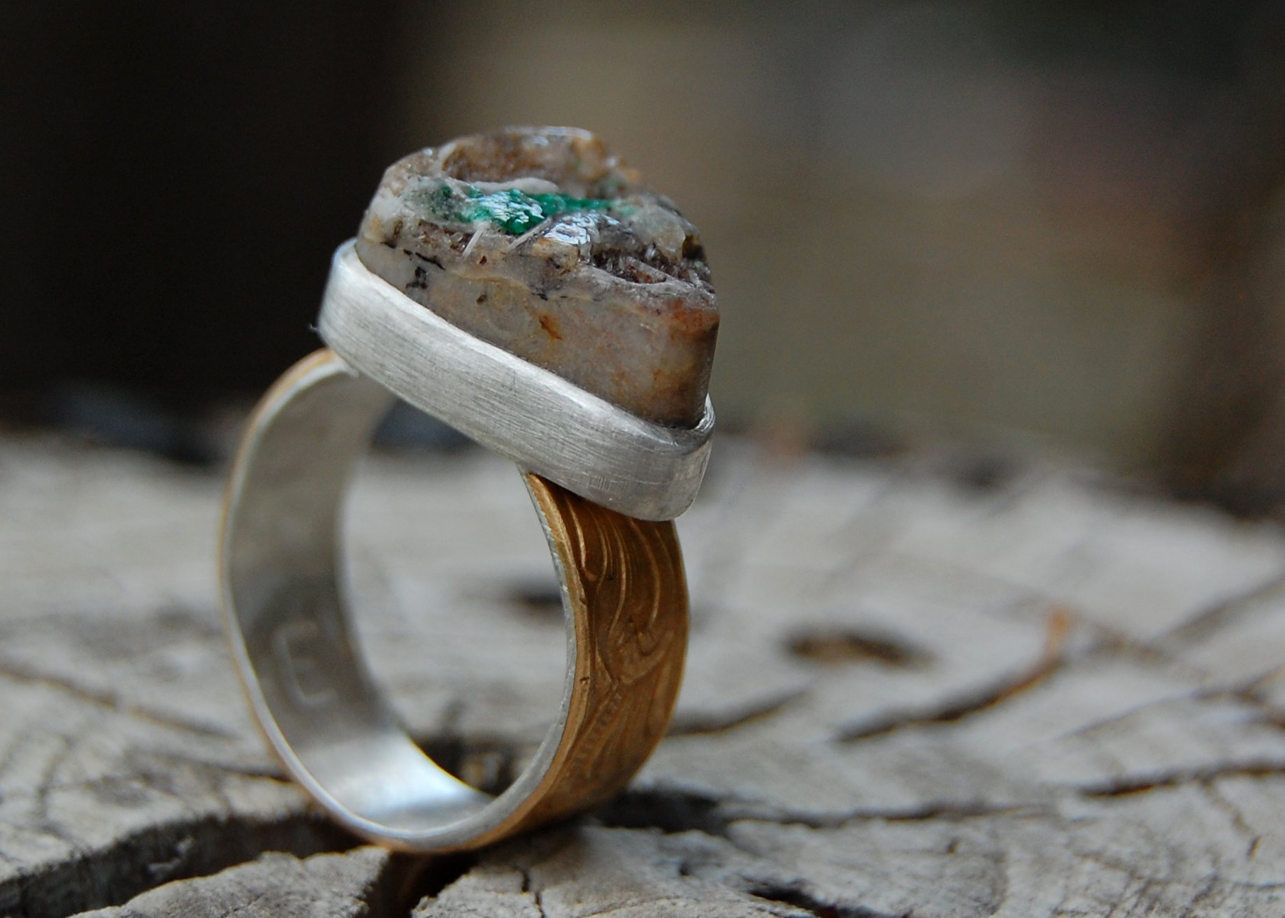 Royal Flush Mine Ring, sterling silver, red brass, malachite, barite y mas